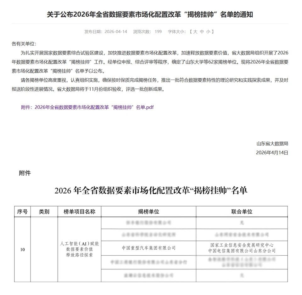 近日,山东省大数据局正式发布2026年数据要素市场化配置改革“揭榜挂帅”名单,中国重汽凭借在数智化领域的深厚积淀与实力,成功揭榜“人工智能赋能数据要素价值释放路径探索”课题!