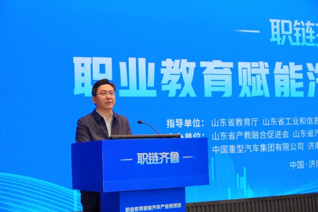 为深入贯彻国家产教融合发展战略,赋能产业能级跃升,助力山东省工业经济“头号工程”落地见效,4月24日,“职链齐鲁”职业教育赋能汽车产业链活动在中国重汽集团成功举办。山东省委教育工委常务副书记,省教育厅党组书记、厅长陈必昌,省委教育工委委员,省教育厅党组成员、副厅长李鹏出席活动并讲话。中国重汽集团党委副书记、总经理刘伟致辞,党委副书记蒋朋朋发布“产教融合·菁英护航”专项计划。